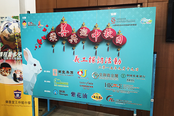 2015年9月19日(星期六),由九龙乐善堂主办、九龙城及油尖旺区福利办事处及多家支持机构协办的“乐善共迎中秋日”义工探访活动于新蒲岗乐善堂王仲铭中学顺利举行。本次大型中秋节上门探访活动涉及的探访区域有九龙城、土瓜湾、红磡、新启德以及大角咀地区,旨在关心区内独居或体弱的长者以及有需要家庭的健康,为他们送上节日的祝福以及生活的必需品。